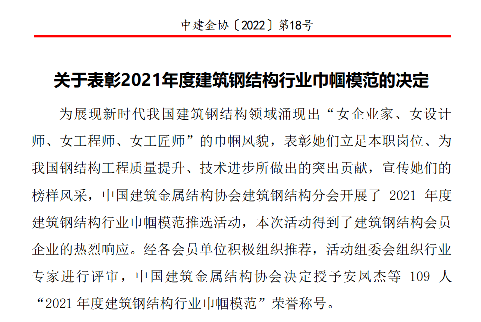 近日,中國建筑金屬結(jié)構(gòu)協(xié)會在全國范圍內(nèi),評選出109名2021 年度建筑鋼結(jié)構(gòu)行業(yè)巾幗模范,淮安市揚子鋼結(jié)構(gòu)工程有限公司董事長余秀萍同志成功入選。
