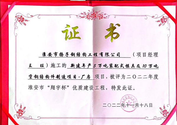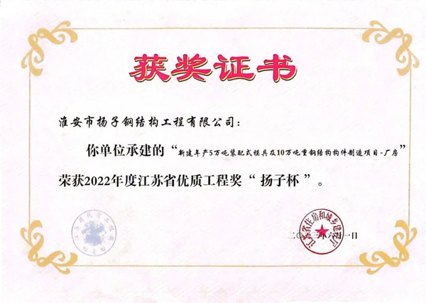 近日,省住房和城鄉(xiāng)建設(shè)廳公布了2022年度江蘇省優(yōu)質(zhì)工程獎(jiǎng)“揚(yáng)子杯”獲獎(jiǎng)項(xiàng)目名單。淮安市揚(yáng)子鋼結(jié)構(gòu)工程有限公司(以下簡(jiǎn)稱“揚(yáng)子鋼構(gòu)”)承建的“新建年產(chǎn)5萬(wàn)噸裝配式模具及10萬(wàn)噸重鋼結(jié)構(gòu)構(gòu)件制造項(xiàng)目-廠房”項(xiàng)目名列其中。